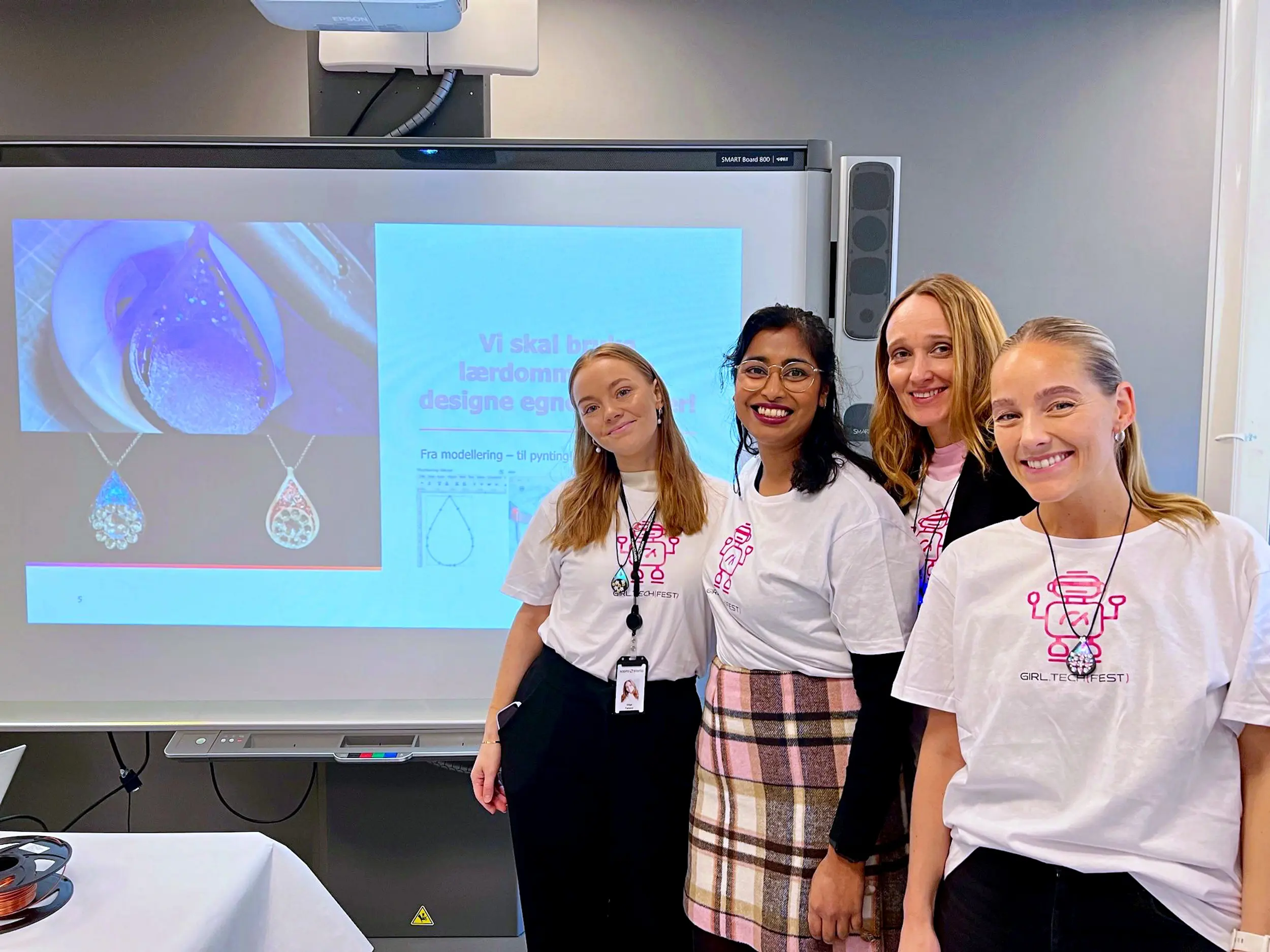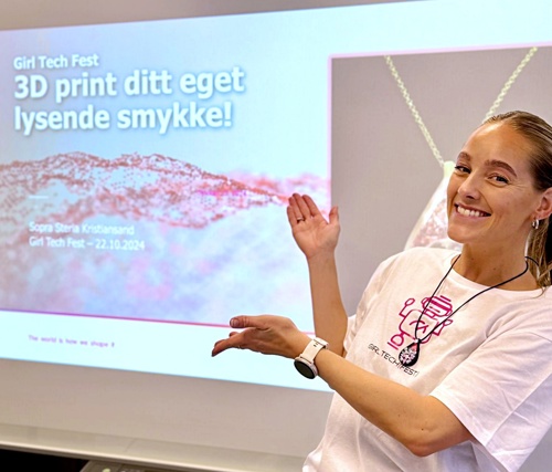 Blant de mange spennende stasjonene som var tilgjengelige på Kristiansand Folkebibliotek, besøkte vi Sopra Steria sin workshop. Her hadde de satt opp en kreativ aktivitet der jentene fikk lage sine egne smykker ved hjelp av 3D-printere. Smykkene ble ikke bare printet der og da, men ble også utstyrt med RGB LED-lys og små pre-programmerte chip-er som styrte lysfrekvensen. Prosessen inkluderte å fylle smykkene med resin som ble herdet ved hjelp av en UV-lampe, utstyr som brukes i neglsalonger. Etterpå kunne jentene dekorere smykkene med krystall-klistermerker for å gi dem en personlig touch. Dette var en stor suksess blant deltakerne, og jentene elsket å kunne designe og bygge sine egne unike teknologismykker.